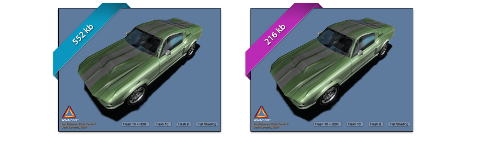 This screenshots on the left shows a Flash 10 SWF Movie (courtesy of Away3D) once it has been exported from Flash. The size of the file is 552k and it has NOT been optimized by SWF Compress™ 1.0..
