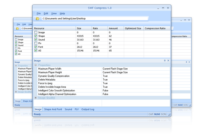 SWF Compress uses unique compression algorithms to optimize shapes, fonts, images, audio and more.